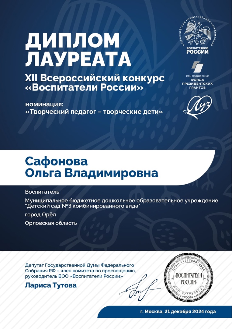 Диплом 1 место XII Всероссийский конкурс Воспитатели России Орловская область